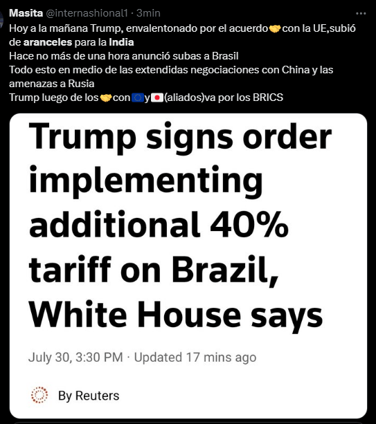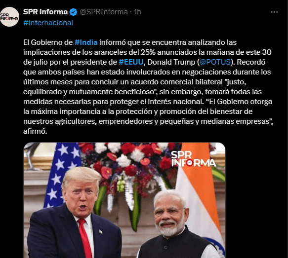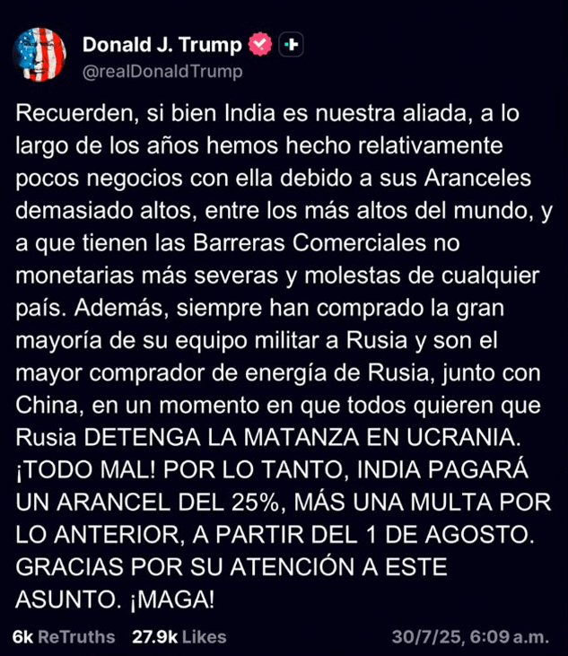Regeneración, 30 de julio de 2025. Trump anunció aranceles del 25% a los productos de la República de la India así como una sanción económica por ser principal comprador de armas y energía a Rusia.