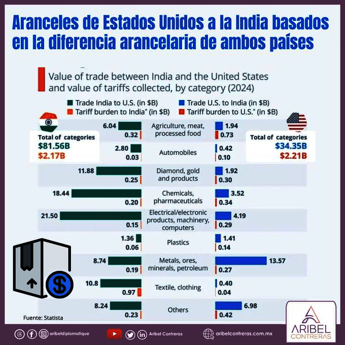 Por una parte, se indica que las exportaciones de bienes de la India a EE.UU rondaron los 87 mil millones de dólares en 2024.