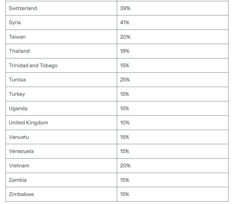 Las nuevas tarifas aduaneras oscilan entre el 5% por ciento y el 41% para Siria, mientras que la Unión Europea (UE), Japón y Corea del Sur estarán sujetos al 15%.