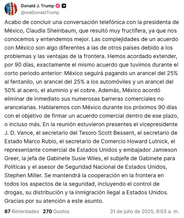 E incluso se precisa que los nuevos aranceles comenzarán a cobrarse el 7 de agosto, para dar tiempo a las aduanas de prepararse. Lo anterior, informó un alto cargo estadounidense a periodistas.
