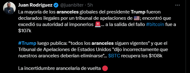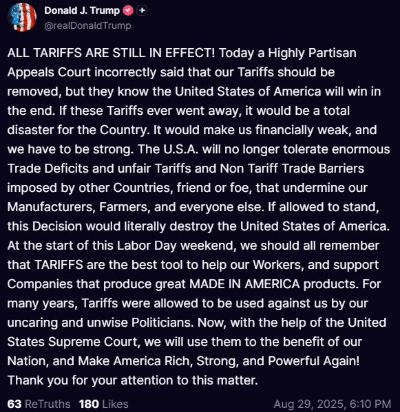 “¡TODOS LOS ARANCELES SIGUEN EN VIGOR! Hoy, un tribunal de apelación altamente partidista ha declarado erróneamente que nuestros aranceles deben eliminarse…»
