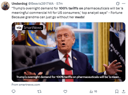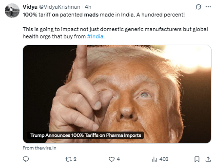 Regeneración, 26 de septiembre 2025– El presidente Donald Trump anunció este jueves que los productos farmacéuticos patentados estarán sujetos a un arancel del 100 % a partir del 1 de octubre, a menos que el fabricante esté construyendo una planta de producción en Estados Unidos.