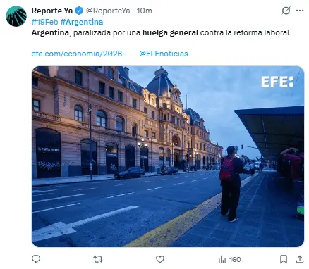 Regeneración, 19 de febrero 2026– El paro de 24 horas comenzó a las 00:00, hora local, convocado por la Confederación General del Trabajo (CGT), el Frente Sindical Unido que incluye las dos Centrales de Trabajadores de Argentina (CTA), la Asociación de Trabajadores del Estado (ATE).