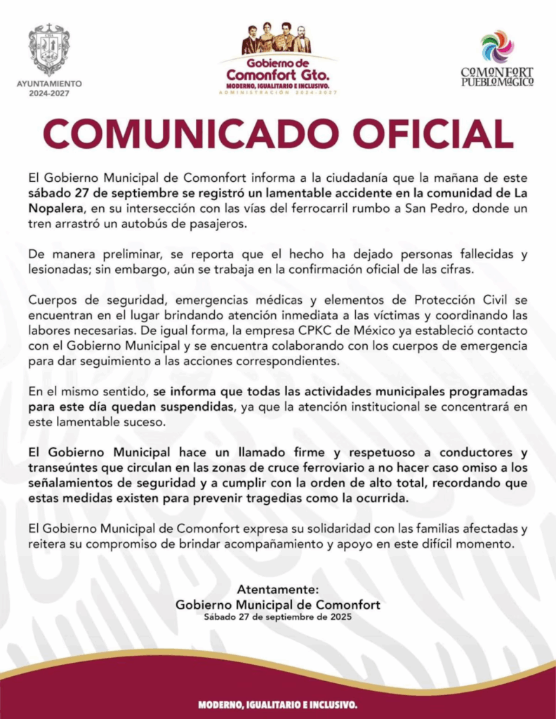 “El Gobierno Municipal de Comonfort expresa su solidaridad con las familias afectadas.