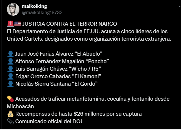 Por otra parte, en redes se destaca que la violencia en la región es por la confrontación entre el Cártel Jalisco Nueva Generación (CJNG) y el cártel local liderado por Juan José Farías, alias «El Abuelo».