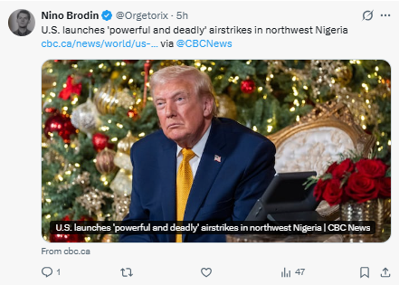 El Ministerio de Relaciones Exteriores de Nigeria confirmó su cooperación con EE. UU. en los ataques aéreos contra “objetivos terroristas”.