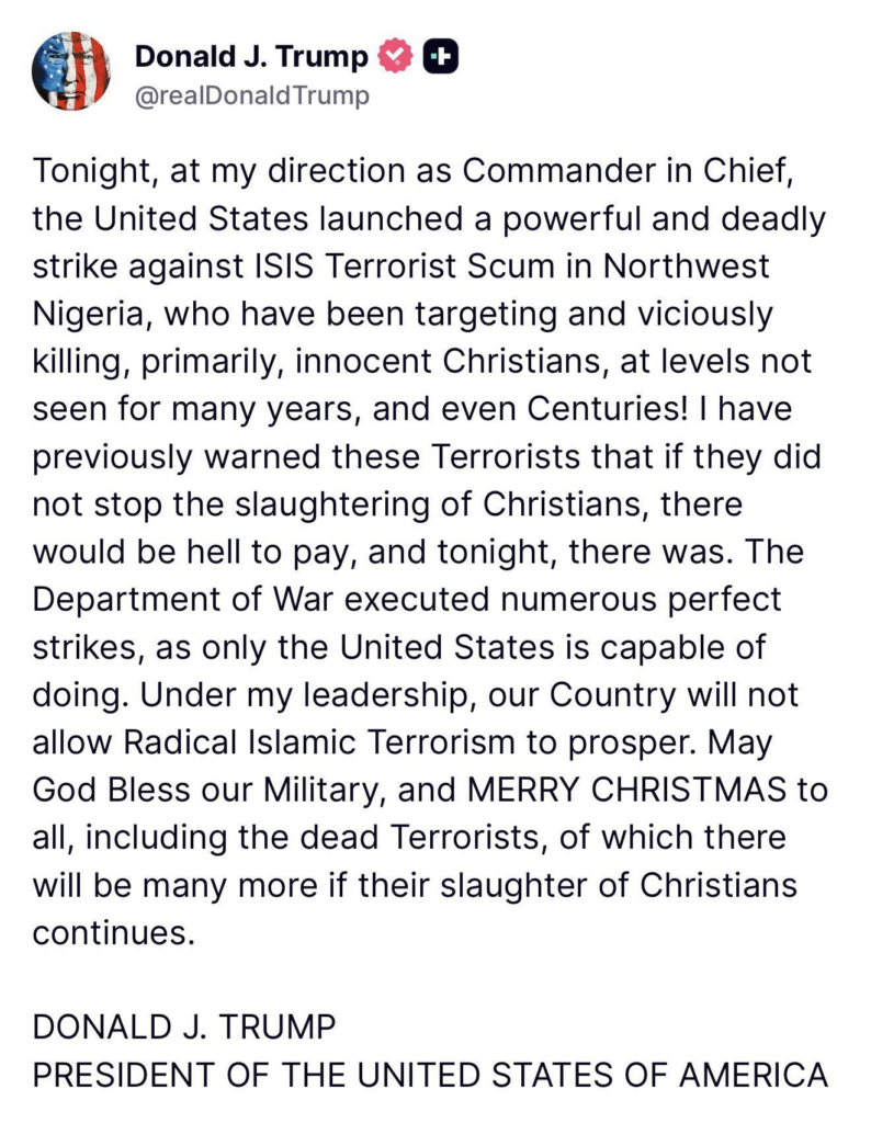 A través de las redes sociales, Trump comentó que ordenó un “ataque poderoso y letal contra integrantes de ISIS en el noroeste de Nigeria”.