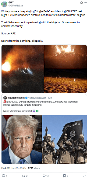 En un comunicado previo que se publicó en X el jueves y que fue retirado más tarde, AFRICOM mencionó que llevó a cabo el ataque a petición de las autoridades nigerianas.