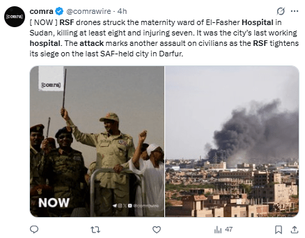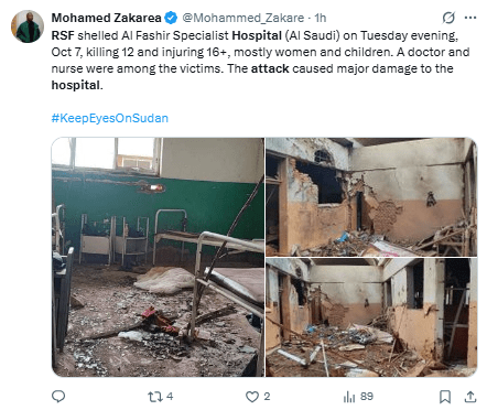 Regeneración, 8 de octubre 2025– Al menos 12 personas murieron y 17 resultaron heridas cuando las Fuerzas paramilitares de Apoyo Rápido (RSF) bombardearon un hospital en el estado de Darfur del Norte, en Sudán, dijeron fuentes médicas.