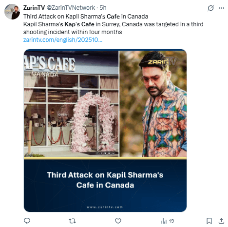 El popular café de Kapil Sharma en Surrey, Canadá, Kap’s Cafe, ha sido atacado por tercera vez.