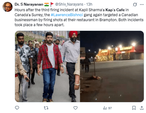 Es el tercer ataque en el Kap´s Café de Kapil Sharma: Asociados del gánster Bishnoi se atribuyen la responsabilidad