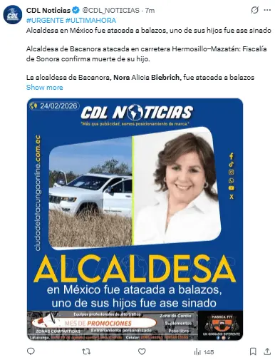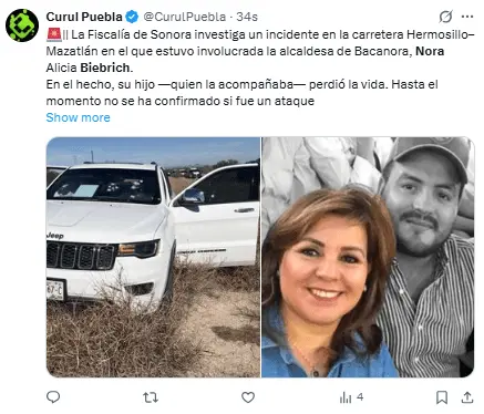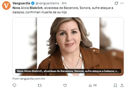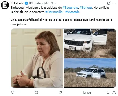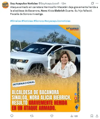 Regeneración, 24 de febrero 2026–(Redacción) La alcaldesa de Bacanora, Sonora, Nora Alicia Biebrich Duarte, y su hijo estaban viajando de Hermosillo a Mazatán cuando fueron atacados por individuos armados alrededor de las 11 de la mañana de este martes.