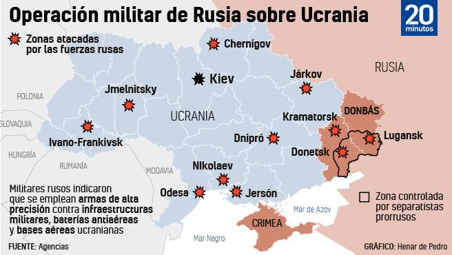 Regeneración, 24 de febrero de 2022. Las operaciones militares rusas en Ucrania comprenden un conjunto de ataques y bombardeos contra posicione estratégicas ucranianas. Hasta el momento los medios señalan 40 personas muertas entre civiles y militares
