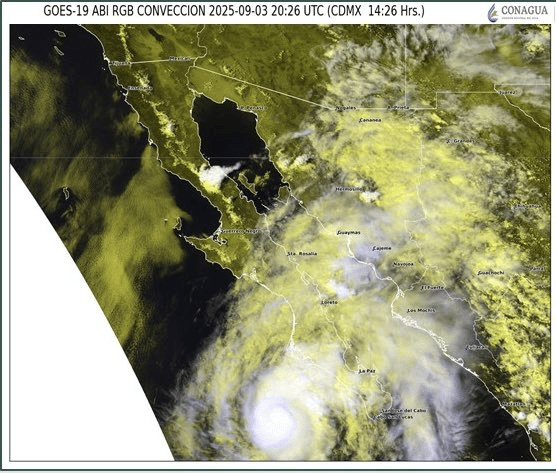 Regeneración, 3 de septiembre de 2025. Las costas del Pacífico mexicano se preparan para el impacto del huracán Lorena, que ha evolucionado a categoría 1 y se desplaza hacia la península de Baja California.