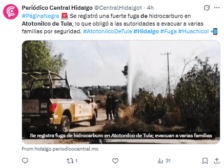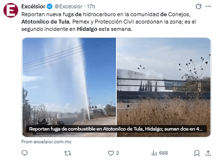 Regeneración, 12 de diciembre 2025– Una fuga de diésel en un ducto de Petróleos Mexicanos (Pemex), se registró en Conejos, municipio de Atotonilco de Tula, Hidalgo, por lo que al menos 20 familias fueron desalojadas debido al riesgo que representaba la concentración del hidrocarburo en la zona.