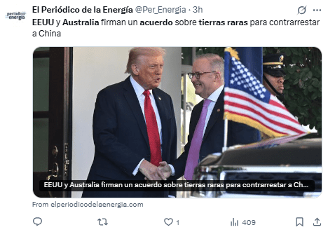 Regeneración, 21 de octubre 2025– Beijing ha declarado que endurecerá las exportaciones de tierras raras, lo que ha llevado a Washington a imponer más aranceles a sus productos. Ahora, Australia y EE.UU quieren contrarrestar el dominio chino del mercado de minerales críticos.