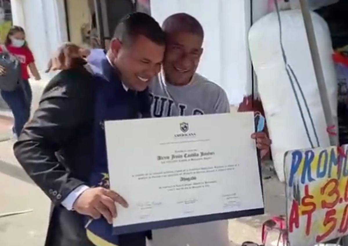 Video: Joven dedica título universitario a su padre y lo visita en su puesto ambulante