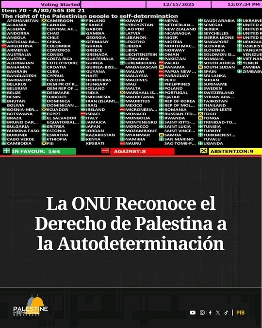 Regeneración, 16 de diciembre 2025– La Asamblea General de las Naciones Unidas aprobó, por amplia mayoría, una resolución que afirma el derecho del pueblo palestino a la autodeterminación y al establecimiento de un Estado independiente.