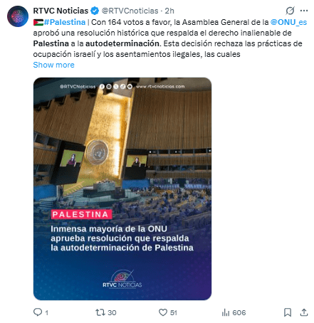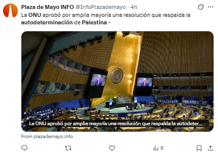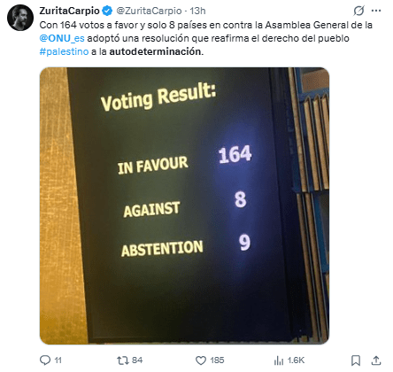 Agradeció a los países que votaron a favor y subrayó que el resultado refleja un consenso internacional casi unánime sobre el derecho del pueblo palestino a decidir su futuro.