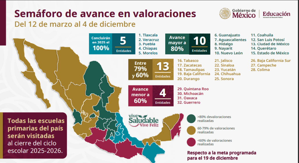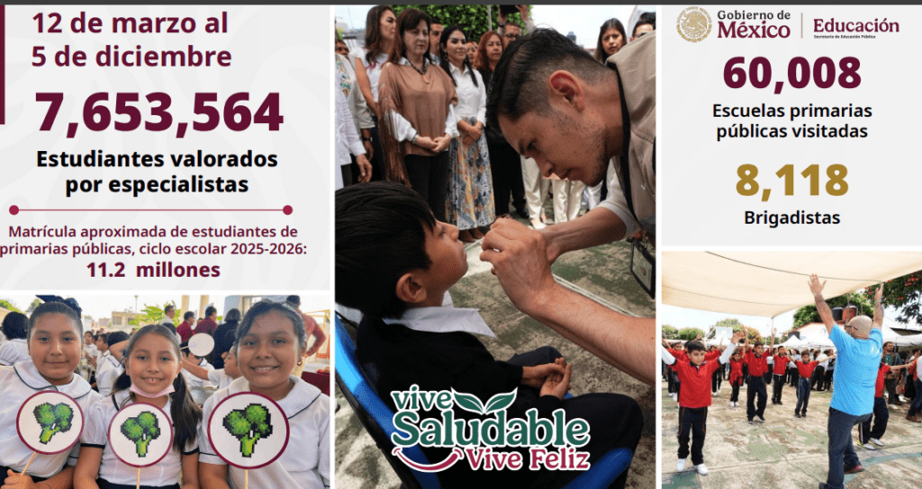 Finalmente, como parte de la estrategia Vive Saludable, vive feliz, se han valorado a 7 millones 653 mil 564 estudiantes de 60 mil primarias.