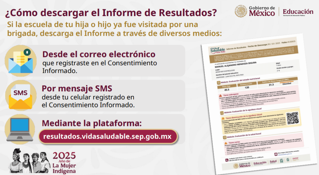 Esto, para recoger los resultados de la evaluación de la salud de sus hijos, que pueden ser enviados por correo electrónico, por SMS o a través de la página: https://resultados.vidasaludable.sep.gob.mx./inicio