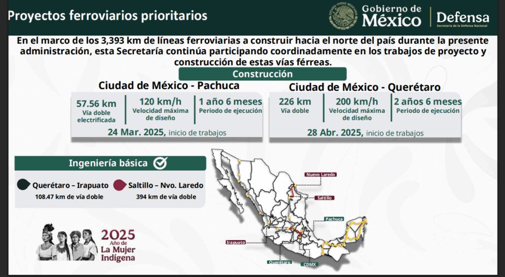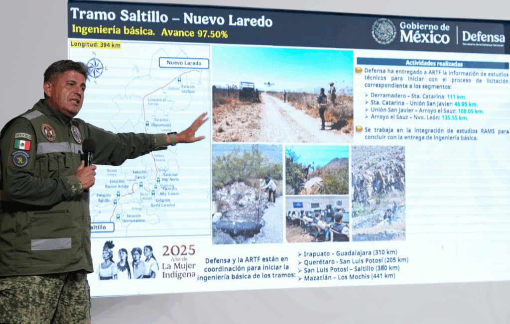 Agregó que apoyan a la ARTF en la ingeniería básica del tren Querétaro-Irapuato, la cual lleva un avance del 93 por ciento y del tren Saltillo-Nuevo Laredo con un progreso del 97 por ciento.