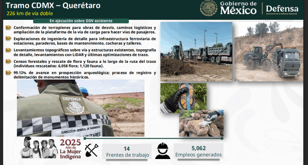Sobre el tren Ciudad de México-Querétaro, informó que se han generado 5 mil empleos y se trabaja en la conformación de terraplenes para obras de desvío y caminos logísticos.
