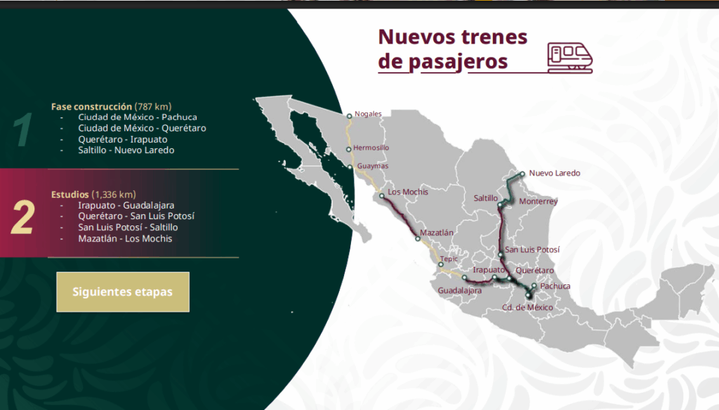 Además, entran en fase de estudios las rutas: Irapuato – Guadalajara, Querétaro-San Luis Potosí, San Luis Potosí-Saltillo y Mazatlán-Los Mochis.