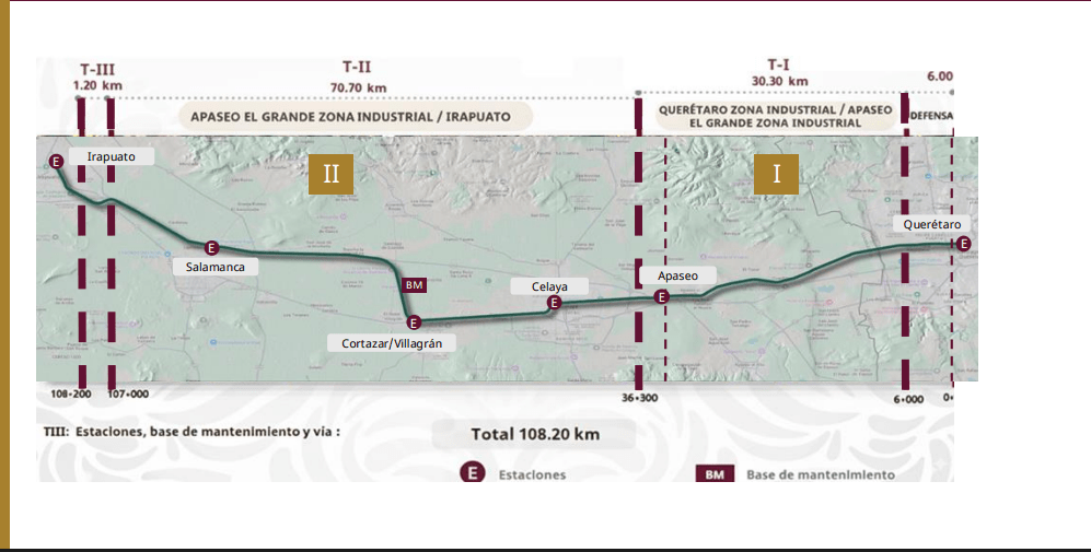 El Tren Querétaro-Irapuato tendrá cuatro estaciones y dos terminales: Querétaro, Apaseo el Grande, Celaya, Villagrán/Cortázar, Salamanca e Irapuato.