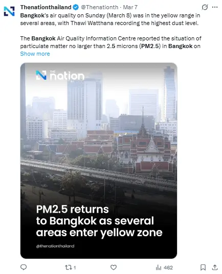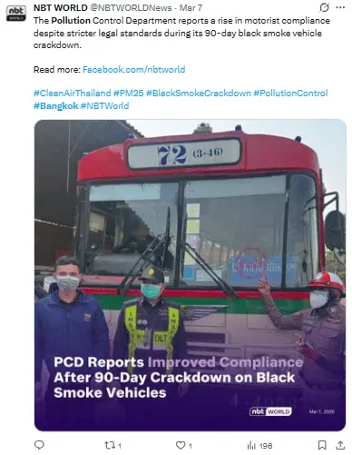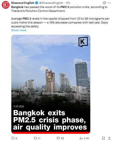 Regeneración, 11 de marzo 2026– El Departamento de Control de la Contaminación de Tailandia afirma que Bangkok ha dejado atrás lo más grave de su problemática de contaminación por PM2.5, con una calidad del aire mejorando en general en relación al año anterior.