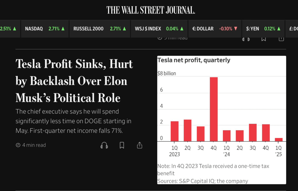 Tesla vio caer su beneficio neto un 71% interanual en el primer trimestre de 2025, «un desplome que se atribuye, entre otros factores, a las actividades políticas de su CEO, Elon Musk».