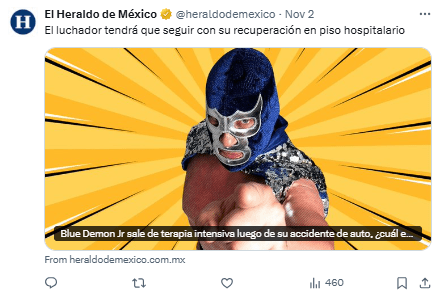 Regeneración, 4 de noviembre 2025– Blue Demon Jr., uno de los íconos del pancracio nacional, continúa evolucionando de forma positiva tras el accidente automovilístico que sufrió la madrugada del lunes 27 de octubre en la Ciudad de México.