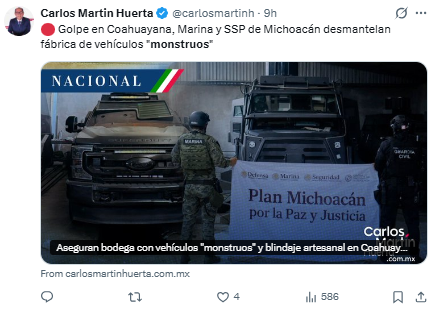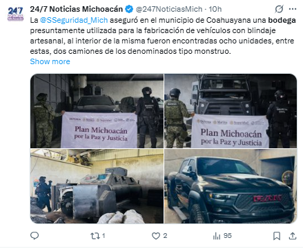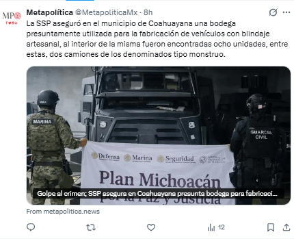 Regeneración, 22 de diciembre 2025– La Secretaría de Seguridad Pública (SSP) aseguró en Coahuayana una bodega presuntamente utilizada para la fabricación de vehículos con blindaje. Al interior se encontraron ocho unidades, entre estas, dos camiones de los denominados «monstruo».