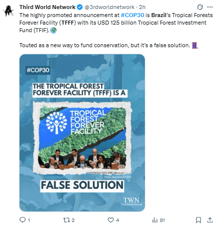 A pesar de haber sido presentado como un modelo innovador, TFFF ha recibido críticas de ecologistas, movimientos sociales y organizaciones internacionales.