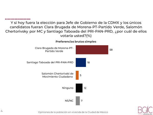 Y es que si hoy «fueran las elecciones para Jefe de Gobierno de las Ciudad de México y los únicos candidatos fueran Clara Brugada de Morena-PT-Verde, Salomón Chertorivski por MC y Santiago Taboada del PRI-PAN-PRD, ¿por cuál de ellos votarías usted».
