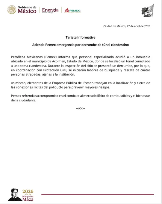 Autoridades y Pemex realizan excavaciones en Acolman para localizar a cuatro personas desaparecidas dentro de túnel clandestino