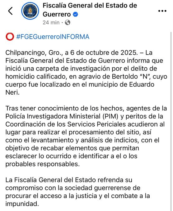 Fiscalía de Guerrero confirmó detenido de identidad reservada que habría sido copartícipe en la muerte de Bertoldo Pantaleón el 4 de octubre