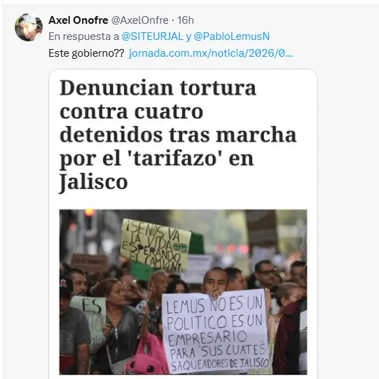Regeneracion, 6 de marzo de 2026. El goberanador de Jalisco, Lemus de Movimento Ciudadano retiró las medidas del tarifazo-tarjetazo que elevaban de $9.50 a $14 el costo del viaje en la zona metropolitana de Guadalajara, quedando el criterio técnico de $11.