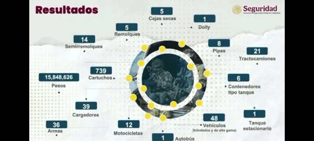También se aseguraron «36 armas de fuego, 48 vehículos, 21 tractocamiones, 14 contenedores tipo tanque y autotanque, se clausuraron 2 tomas clandestinas».