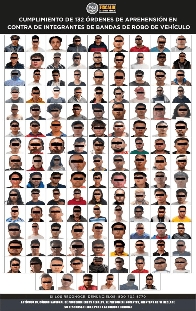 Regeneración, 9 de mayo de 2025. La Fiscalía General de Justicia del Estado de México (FGJEM) informó que cumplimentó 132 órdenes de aprehensión contra bandas delictivas que roban vehículos.