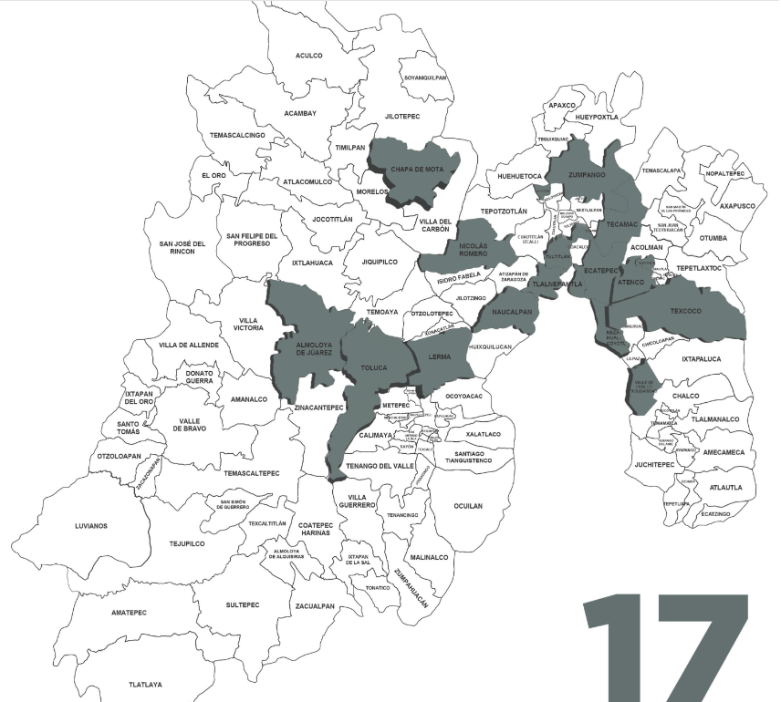 Junto con Chicoloapan, Chimalhuacán, Ecatepec, Ixtapaluca, La Paz, Metepec, Naucalpan, Neza, N. Romero, Tecámac, Tepotzotlán, Texcoco, Tlalnepantla, Toluca, Tultitlán, Chalco y Zumpango.