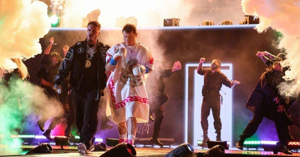 3. El cantante J. Balvin hizo un pequeño show antes de presentar a ‘grito pelado’ al boxeador mexicano: «les presento a mi amigo, a mi parcero, Saúl ‘Canelo’ Álvarez». Y después, ambos recorrieron la pasarela para llegar al ring, mientras el artista seguía cantando su éxito ‘Mi gente’.