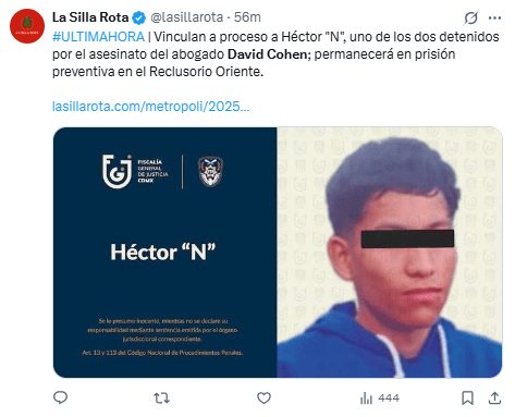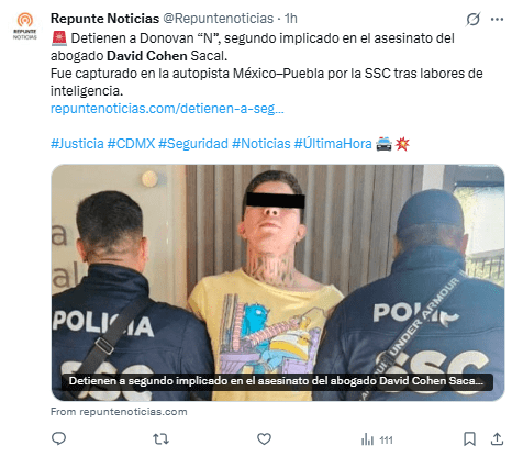 Regeneración, 17 de octubre 2025– Policías de la Ciudad de México detuvieron a Donovan “N”, uno de los presuntos responsables del homicidio del abogado David Cohen, ocurrido el pasado 13 de octubre en calles de la alcaldía Cuauhtémoc.