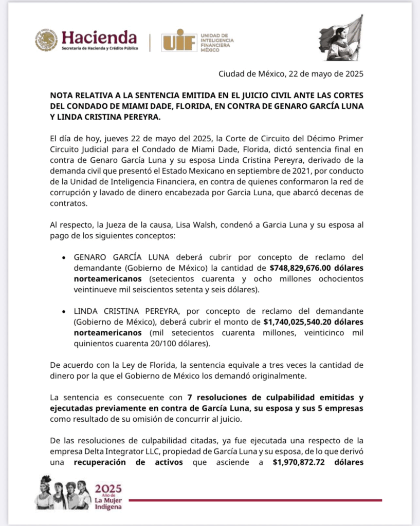 Asimismo, detalla la Inteligencia Financiera, «los recursos líquidos recuperados fueron ingresados de inmediato a la Tesorería de la Federación».