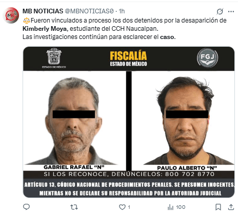 Regeneración, 17 de octubre 2025– La investigación sobre la desaparición de Kimberly Moya, estudiante del CCH Naucalpan desaparecida el 2 de octubre, avanza con la reciente vinculación a proceso de dos presuntos responsables.
