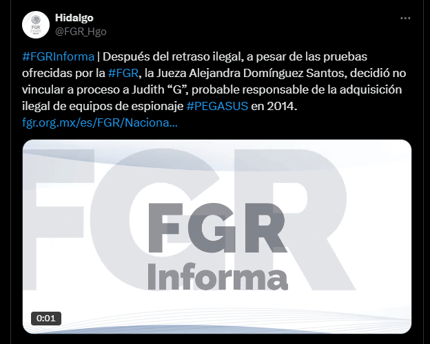 Regeneración, 18 de junio de 2025. Por medio de redes sociales la Fiscalía federal denunció que tras dos años y medio de dilación una jueza de control absolvió a la acusada por compra de equipo de espionaje conocido como Pegasus.