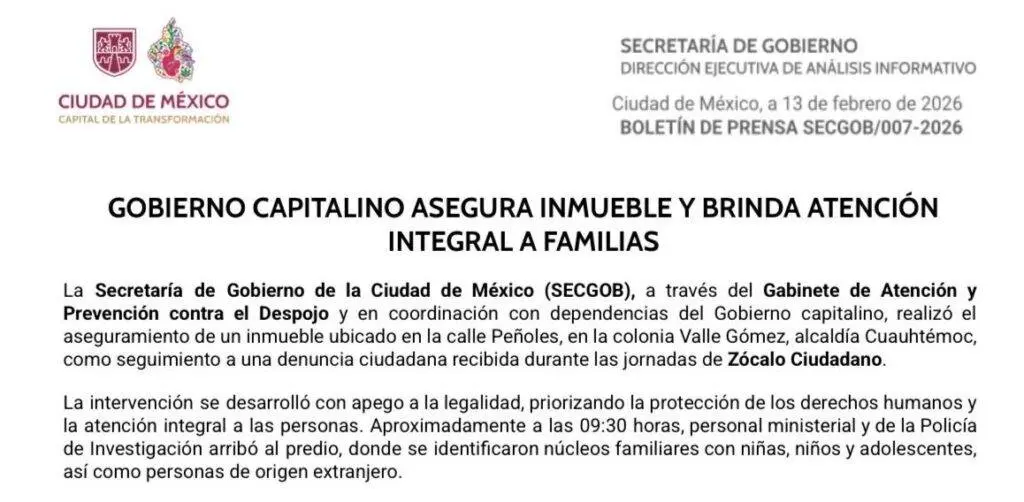 Regeneración, 13 de febrero de 2026.– El Gobierno de la Ciudad de México recuperó un inmueble en la colonia Valle Gómez. La Secretaría de Gobierno encabezó esta acción legal en la alcaldía Cuauhtémoc.