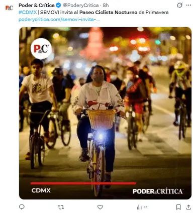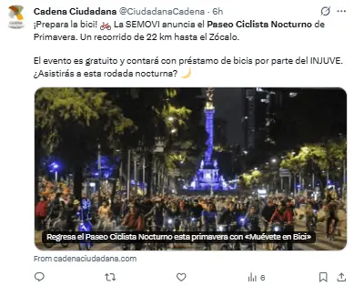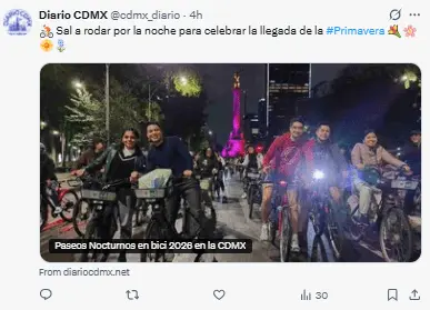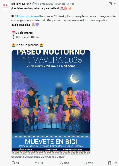 Regeneración, 24 de marzo 2026– La Secretaría de Movilidad (SEMOVI) de la Ciudad de México dio a conocer la organización del Paseo Ciclista Nocturno de Primavera, una de las actividades más esperadas por los residentes que impulsa la movilidad sostenible, el uso de la bicicleta y la recuperación de espacios públicos.