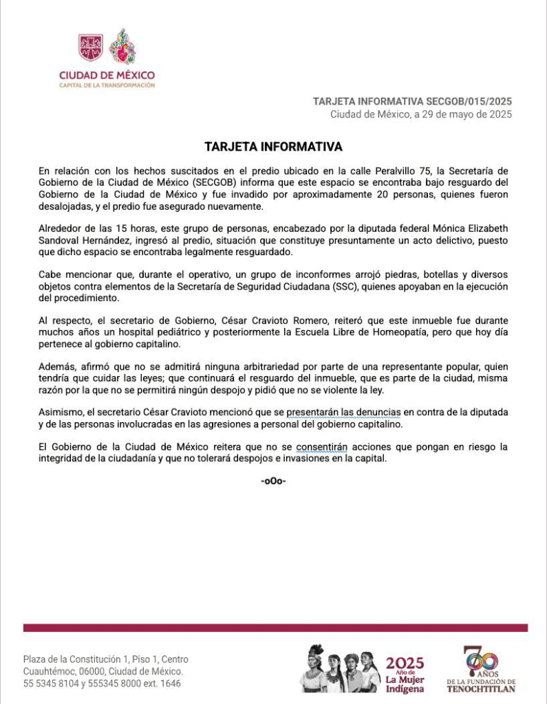Regeneración, 30 de mayo de 2025. El gobierno de la Ciudad de México (CDMX) presentó una denuncia penal en contra de un grupo de personas encabezadas por la diputada federal del PRI intentaron apoderarse del Edificio de la antigua escuela de Homeopatía.
