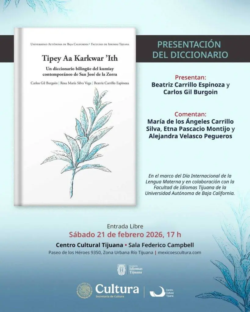 Regeneración, 24 de febrero de 2026.– El Centro Cultural Tijuana presentará un documento histórico este sábado. Se trata del primer diccionario publicado de la lengua kumiay. El evento sucedió el 21 de febrero en la Sala Federico Campbell a las 17:00 horas. Esta obra representa un esfuerzo por rescatar el patrimonio lingüístico regional.
